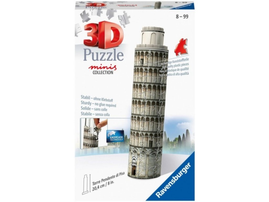 Mini Šikmá věž od výrobce RAVENSBURGER! Speciální zakřivené nebo ohebné dílky, které přesně zapadnou na své místo, umožňují postavit fascinující modely slavných budov. Dílky vyrobeny z pevného plastu zaručí vynikající stabilitu, a celá stavba drží bez nutnosti lepení. Díky originálním doplňkovým dílkům budou vaši stavbu všichni obdivovat. 3D puzzle RAVENSBURGER lze skládat podle motivu (obtížnější varianta) nebo podle praktického číslování na zadní straně dílků. Balení obsahuje : 54 očíslovaných dílků, 6 dílů příslušenství, vnitřní podporu a návod.
