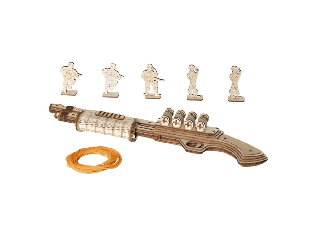Do zbraně! Stavebnice brokovnice z překližky. Detailně provedná, nabízí možnost střílet přibalenými gumičkami na figurky, které jsou součástí stavebnice. Gumičky dokáže střílet s rozptylem po dvojicích, až do vzdálenosti osmi metrů. Okouzlí všechny malé ochránce spravedlnosti. Skládačka je dodávána v nesloženém stavu, balena v krabici. Vybaveno detailním návodem k sestavení. Hlavní vlastnosti:skládačka zbraně, 5 figurek a 10 nábojů170 precizně vyřezaných dílkůnízká obtížnost sestavenídostřel až 8 m