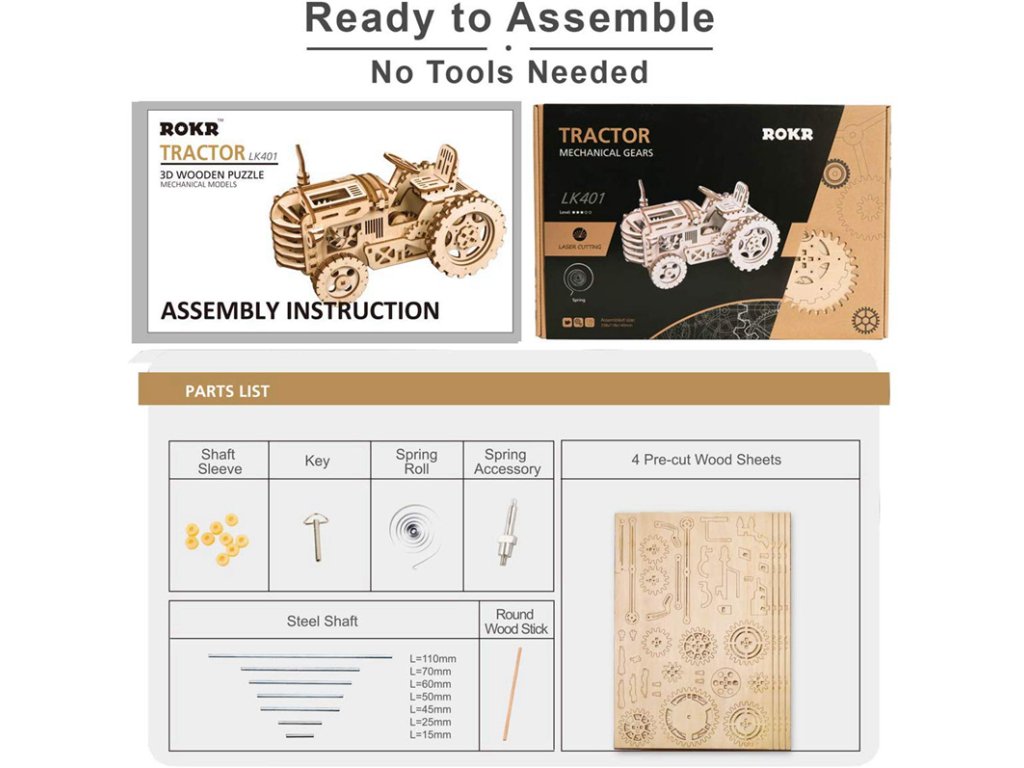 TRAKTOR ROKR LK401 S PŘEVODOVKOU A POHONEM JE BÁJEČNOU DŘEVĚNOU 3D STAVEBNICÍ PRO DĚTI I DOSPĚLÉ.