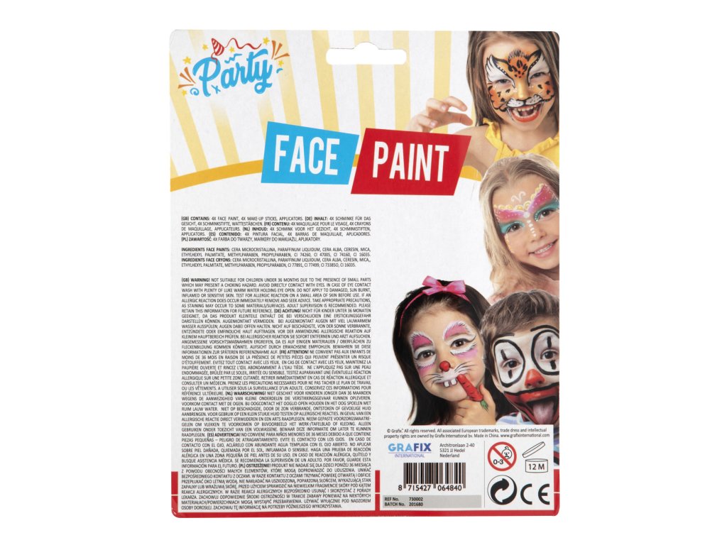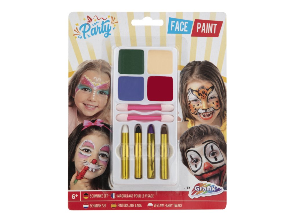 Barvy na obličej párty – balení obsahuje 4 různé barvy na obličej a 4 tužky na obličej se 2 aplikátory. Splňuje normy EU, zdravotně nezávadné.vadné.
