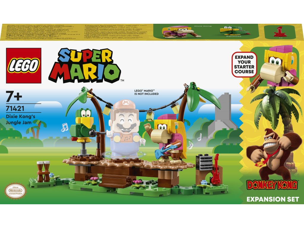Připravte pódium na hudební zábavu – S tímto rozšiřujícím setem LEGO® Super Mario™ (71421) Dixie Kong a koncert v džungli mají děti šanci navštívit džungli, kde žije Donkey Kong, a zažít hudební dobrodružství • 2 postavy LEGO® Super Mario™ z džungle, kde žije Donkey Kong – Dixie Kong s prvkem kytary a papoušek Sqawks se sestavitelným mikrofonem, a navíc sestavitelná bonga a zesilovač • Otáčející se pódia – Postavte LEGO® Maria, LEGO® Luigiho nebo LEGO® Peach™ (figurky nejsou součástí balení) doprostřed pódia a otočte je, aby se propojená pódia začala otáčet a aktivovala hudbu • Společenská hra – Na pódiu je místo pro druhou interaktivní figurku. Set také obsahuje scenérii džungle a 2 sestavitelné palmy, osvětlení a prvky květin • Skvělý dárek pro hráče od 7 let – Tento set s 174 dílky představuje zábavný vánoční či narozeninový dárek pro děti, které vlastní některý ze startovacích setů LEGO® Super Mario™ (71360, 71387 nebo 71403), jenž je k interaktivnímu hraní potřeba • Zábavné kombinace – V základním provedení měří modulární model přes 12 cm na výšku, 24 cm na šířku a 10 cm do hloubky a je navržen tak, aby jej bylo možné kombinovat s dalšími hracími sety pro děti LEGO® Super Mario™ • Digitální návod na stavění – Stáhněte si bezplatnou aplikaci LEGO® Super Mario™ s návody na stavění, inspirativními tipy a spoustou dalšího. Seznam kompatibilních zařízení s operačním systémem Android a iOS najdete na stránce LEGO.com/devicecheck • Inspirace pro dětskou představivost – Sběratelské sety LEGO® Super Mario™ umožňují samostatné i skupinové hraní, přinášejí zábavu při sbírání mincí a neomezené kreativní možnosti v podobě rozšiřování a přestavování • Prémiová kvalita – Dílky LEGO® splňují striktní oborové standardy kvality, takže umožňují jednoduché a bezpečné spojování do robustních modelů • Bezpečnost na prvním místě – Kostky LEGO® pouštíme na zem, drtíme, kroutíme, zahříváme a analyzujeme, abychom zajistili, že splňují přísné globální bezpečnostní normy