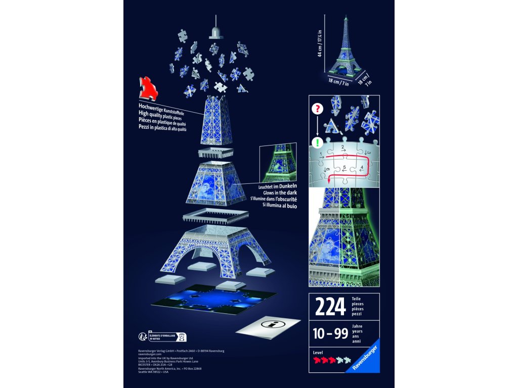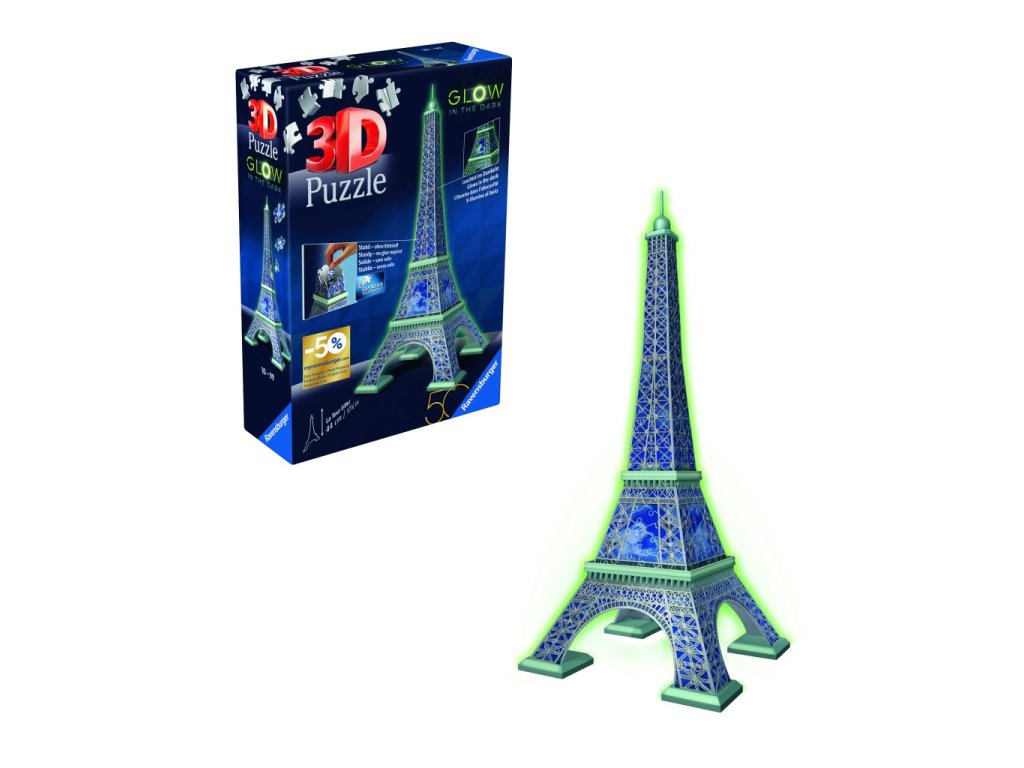 Postavte si osvětlený model noční edice Eiffelovy věže s pomocí stabilních plastových dílků a nechte ho rozzářit pomocí LED světla. Možnost výběru intenzity světla. Luminiscenční plastové dílky 3D Puzzle umožňují, aby Eiffelova věž jemně zářila ve tmě po nabití denním nebo umělým světlem. Kvalitní, plastové puzzle s technologií Easyclick. Bez nutnosti lepení!