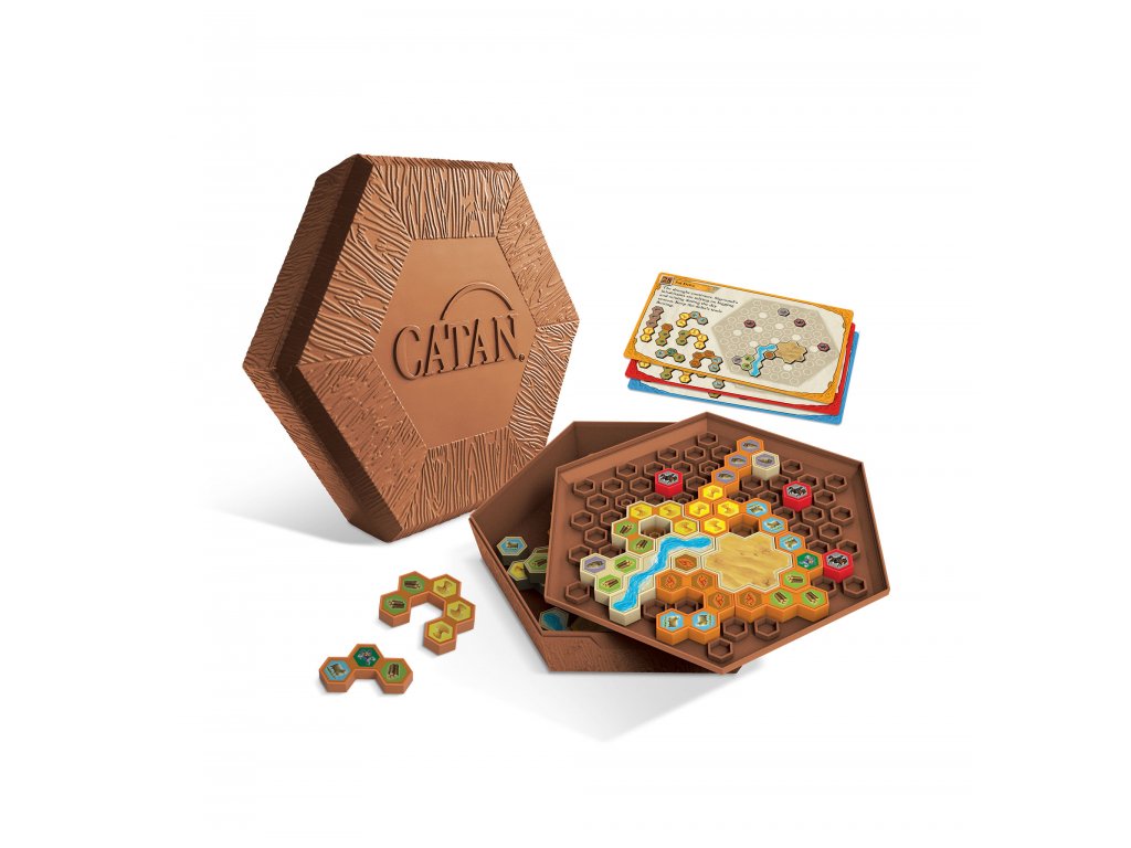 Hra Catan - Logická hra obsahuje: úložnou krabici s herním plánem na víku, 40 karet hádanek, 33 plastových dílků (10 obchodních cest, 5 zlodějů, 5 rytířů, 5 vesnic, 5 měst, 2 řeky, 1 poušť) a pravidla.