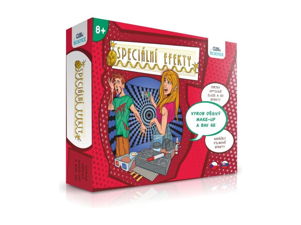 Otestujte na vlastní kůži optické klamy, 3D efekty i umělou krev či jizvu jako z filmu. Sada plná děsivých a vtipných aktivit naučí děti triky, kterými zabodují u svých kamarádů. Kdo vytvoří a šokuje věrohodnější fotkou s jizvou na mobilu? Bláznivá vědecko-kreativní sada šitá na míru dnešním dětem. Sada Speciální efekty obsahuje: 3 míchací dřevěné tyčky, 2 červená barviva na olejové bázi 2 g, prosívací niť, moaré filtry, barvu na obličej, lepicí pásku, červenou fixu, kukuřičný škrob 60 g, kádinky, základní pracovní desku, stojánky na telefon/tablet, 3D brýle, plastovou lžičku, vazelínu, pracovní listy.